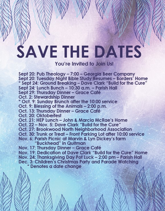 Foyer Groups – Last Call to be included in a Foyer Group for this year. Please let Jeani Synyard know by Sunday, September 18th if you are interested in participating.
