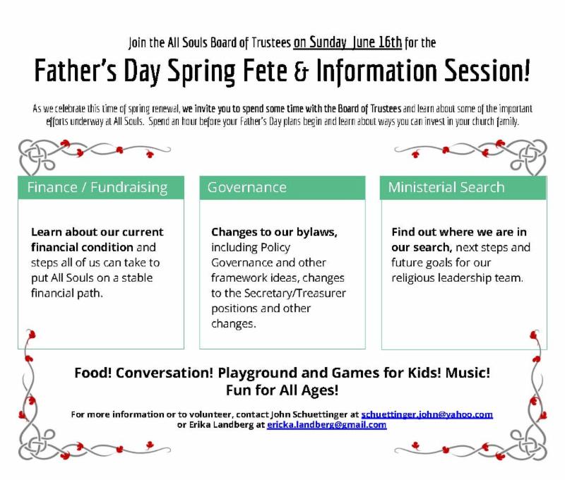 . As we celebrate spring renewal, let’s also envision All Souls’ future. Whether you have Father’s Day plans or not, stop by for an hour with the Board of Trustees as they share some things they’ve been working on. Learn more about our current deficit and fundraising ideas for tackling it, changes to our bylaws and governance policies, our search for a contract minister, and more. We’ll have food, fun for everyone, playground and other space for the kids, and a Board information-sharing space. Questions? Contact John Schuettinger (schuettinger.john@yahoo.com) or Erika Landberg (erika.landberg@gmail.com). Sun., Jun. 16, after worship.