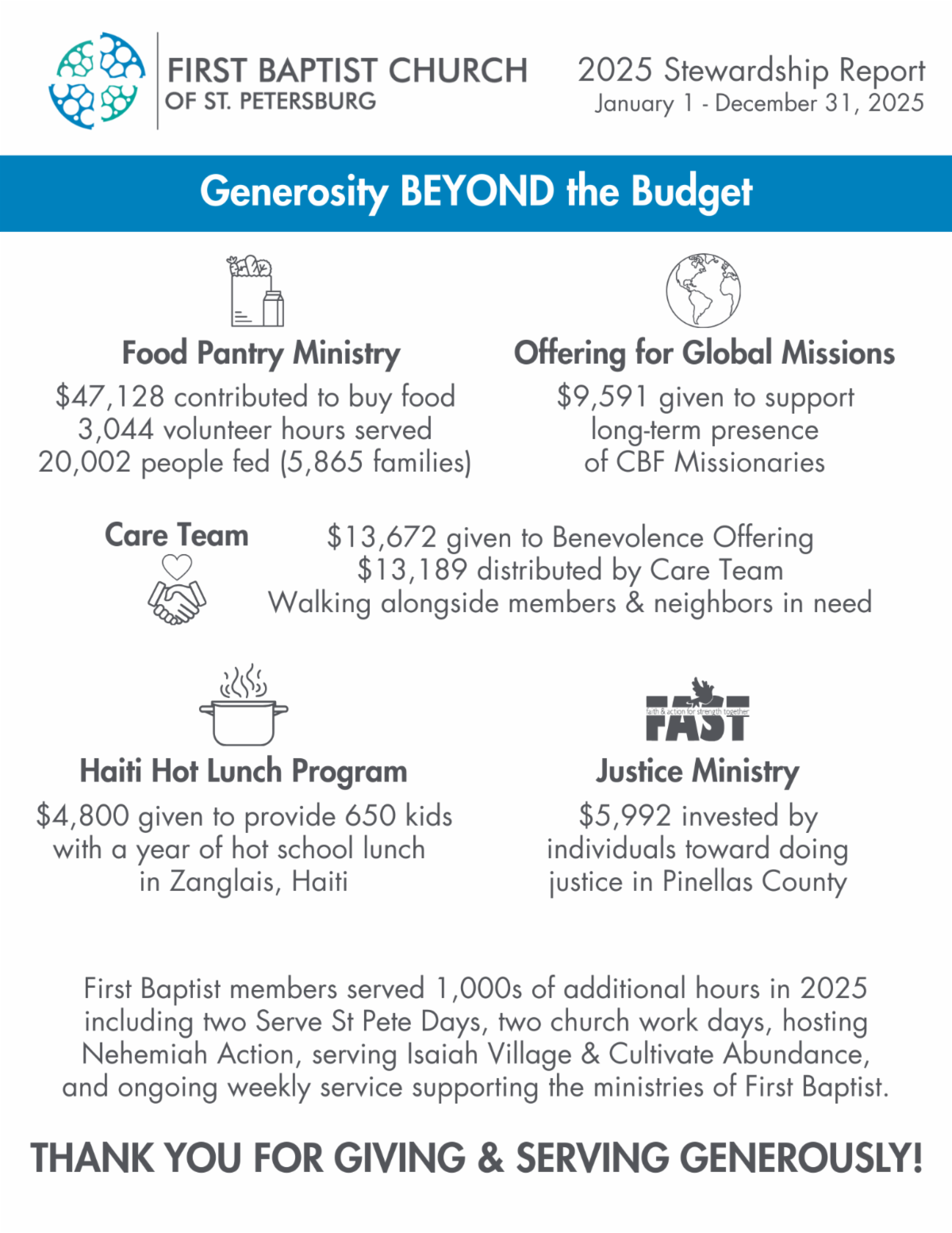And, of course, generosity is not limited only to financial contributions. You are a congregation who is also abundantly generous with your time and effort. Serving in ongoing ministry & mission efforts and one-time outpourings of service. There's really no way to fully account for all the hours invested by those who serve in and through our church throughout the year. THANK YOU!