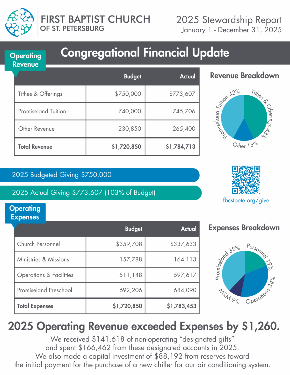 Below you will see our end-of-year 2025 financial update. The shortest version of the story is that despite unforeseen facility expenses (largest of all, roof repairs following Hurricane Milton) our revenues last year were still sufficient to cover our expenses. Thanks be to God, and thank you for your faithful giving to support the ministries of our church!