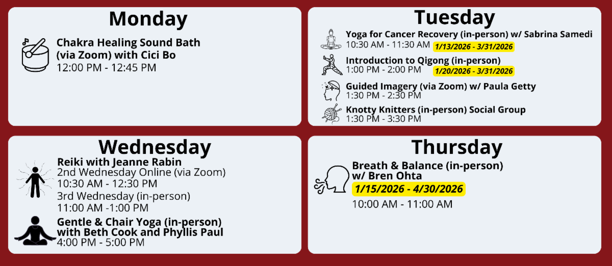 We are excited to re-introduce Qigong for a six-week series for the new year! The ancient Chinese healing art of Qigong is a practice that integrates gentle movement, breath awareness, and mindful focus to enhance the body’s natural healing abilities. Designed especially for cancer survivors and caregivers, this workshop offers a gradual and supportive introduction to Qigong’s core principles and techniques. Participants will learn simple movements to improve circulation, balance, and flexibility while cultivating calmness and vitality. No prior experience is necessary. All levels and physical abilities are welcome. Click here to download the flyer.