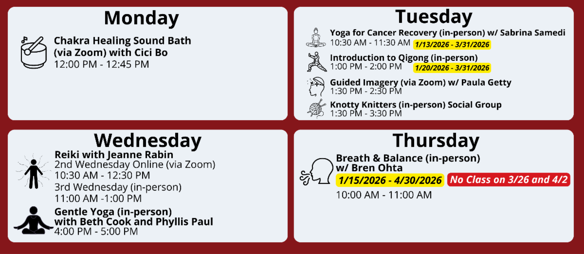 Calm, restore, & rebalance body, mind and spirit through yoga postures, breathing exercises and meditation. This therapeutic, integrative class for people effected by cancer encourages participants of all practice levels to mindfully explore the healing effects of yoga practice for symptom relief from cancer and cancer treatment, flexibility & strengthening. No prior yoga experience is needed. Instructors also welcome participants who prefer modified, upper‑body movements, including Chair Yoga. Before joining the class speak with your doctor to see if this class is right for you. Click here to download the flyer.