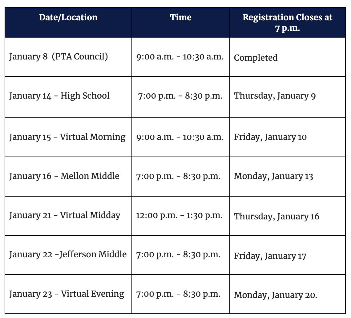 During January, we will hold several 90-minute focus groups co-hosted by the Mt. Lebanon Board of Directors, MTLSD Executive Council, and the Parent Teacher Association. These sessions are open to anyone.
