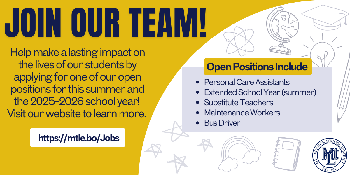 The Mt. Lebanon School District is looking for enthusiastic, dedicated individuals to join our team and support our students during summer programs and throughout the upcoming school year. Whether you're an educator, paraprofessional, or just passionate about helping kids succeed, we’d love to meet you!