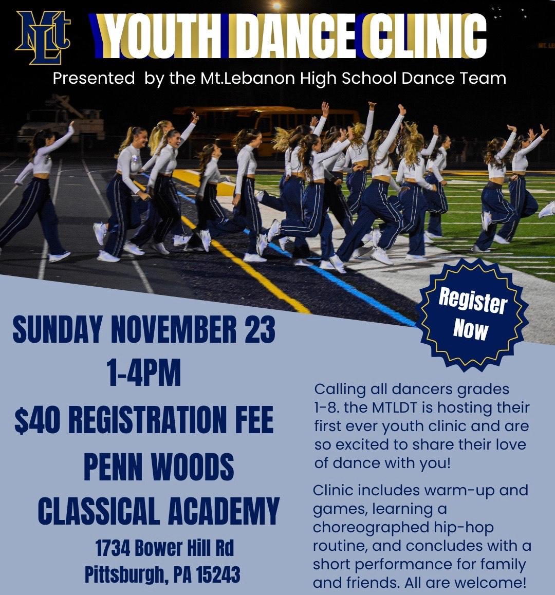 The Mt. Lebanon High School Dance Team will host a youth clinic on Sunday, November 23, from 1:00 - 4:00 p.m. For more information and to register, visit this website.