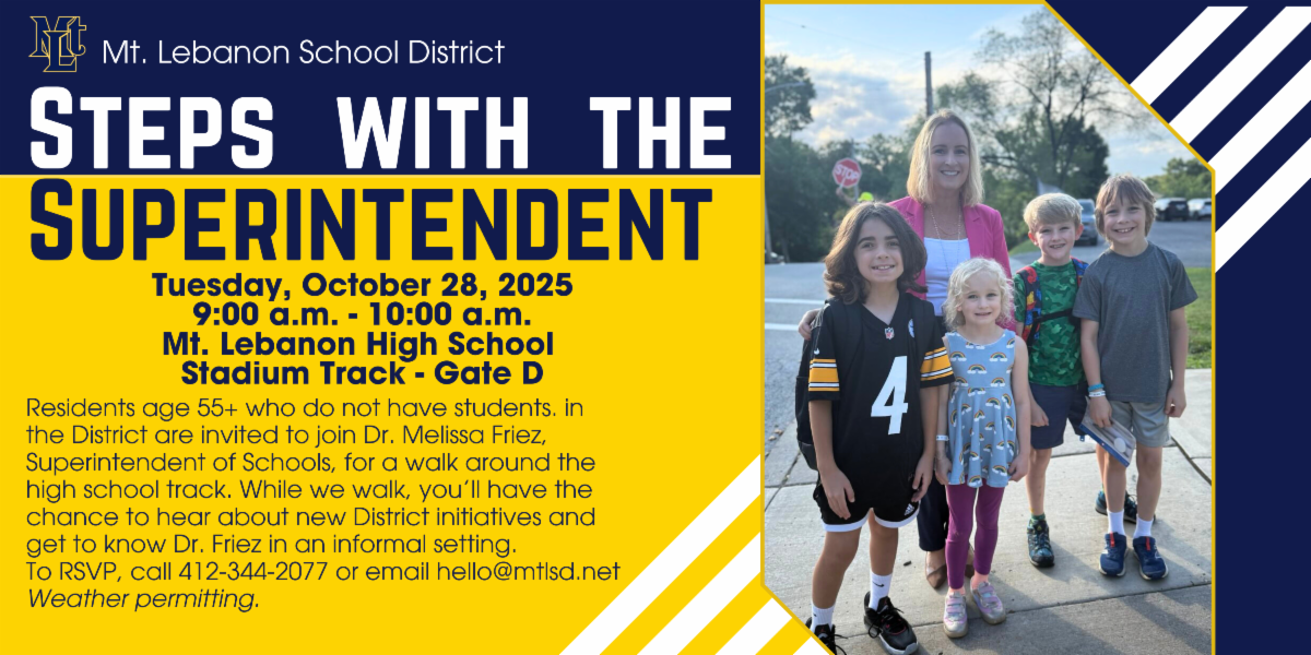 Invite your neighbors, family, and friends aged 55+ living in Mt. Lebanon to join Dr. Melissa Friez for Steps with the Superintendent at the High School Track. To RSVP, email hello@mtlsd.net.