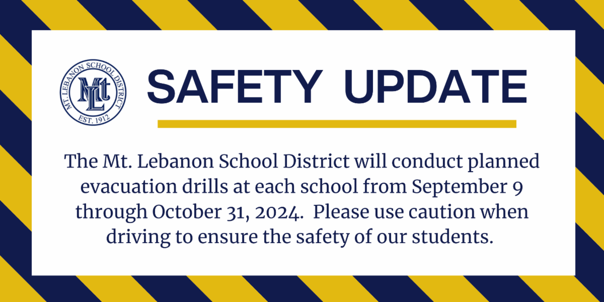 Throughout September and October, you may see students walking throughout the community during the school day as our schools conduct evacuation drills. The purpose of these exercises will be to practice moving as a school to the alternate site safely and efficiently. MTLSD is working with the Mt. Lebanon Police Department and the Mt. Lebanon Fire Department to assist us in this safe and efficient transport.