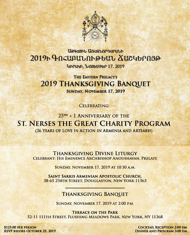 In what will become the beginning of a new tradition, each year a special “Prelacy Thanksgiving Day” will be celebrated honoring one aspect of the Prelacy’s multi-faceted mission. The first “Prelacy Thanksgiving Day” will take place on Sunday, November 17, 2019. The day will begin with the celebration of the Divine Liturgy by Archbishop Anoushavan at St. Sarkis Church in Douglaston, New York, beginning at 10:30 am. A Thanksgiving Banquet will take place after the Liturgy at Terrace on the Park in Flushing Meadows Park in Queens, New York. Cocktail reception will begin at 2 pm with dinner and program at 3 pm.
