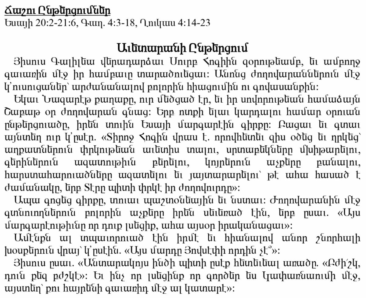 When he came to Nazareth, where he had been brought up, he went to the synagogue on the Sabbath day, as was his custom. He stood up to read, and the scroll of the prophet Isaiah was given to him. He unrolled the scroll and found the place where it was written: "The Spirit of the Lord is upon me because he has anointed me to preach good news to the poor. He has sent me to proclaim release to the captives and recovering of sight to the blind, to set at liberty those who are oppressed, to proclaim the acceptable year of the Lord." And he closed the book and gave it back to the attendant, and sat down; and the eyes of all in the synagogue were fixed on him. And he began to say to them, "Today this scripture has been fulfilled in your hearing." And all spoke well of him, and wondered at the gracious words, which proceeded out of his mouth; and they said, "Is not this Joseph's son?" And he said to them, "Doubtless you will quote to me this proverb, 'Physician, heal yourself; what we have heard you did at Capernaum, do here also in your own country.'"