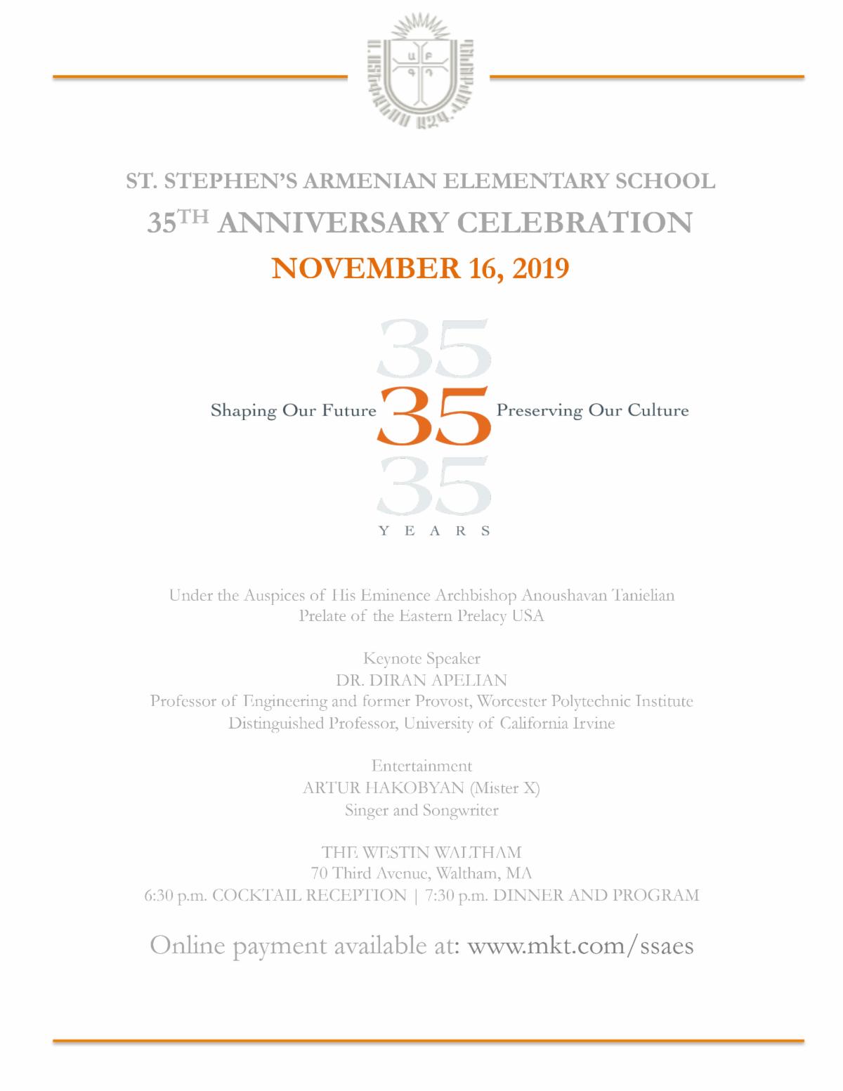 : St. Stephen's Armenian Elementary School 35th Anniversary Gala Celebration, Waltham , MA. See flyer below for details.