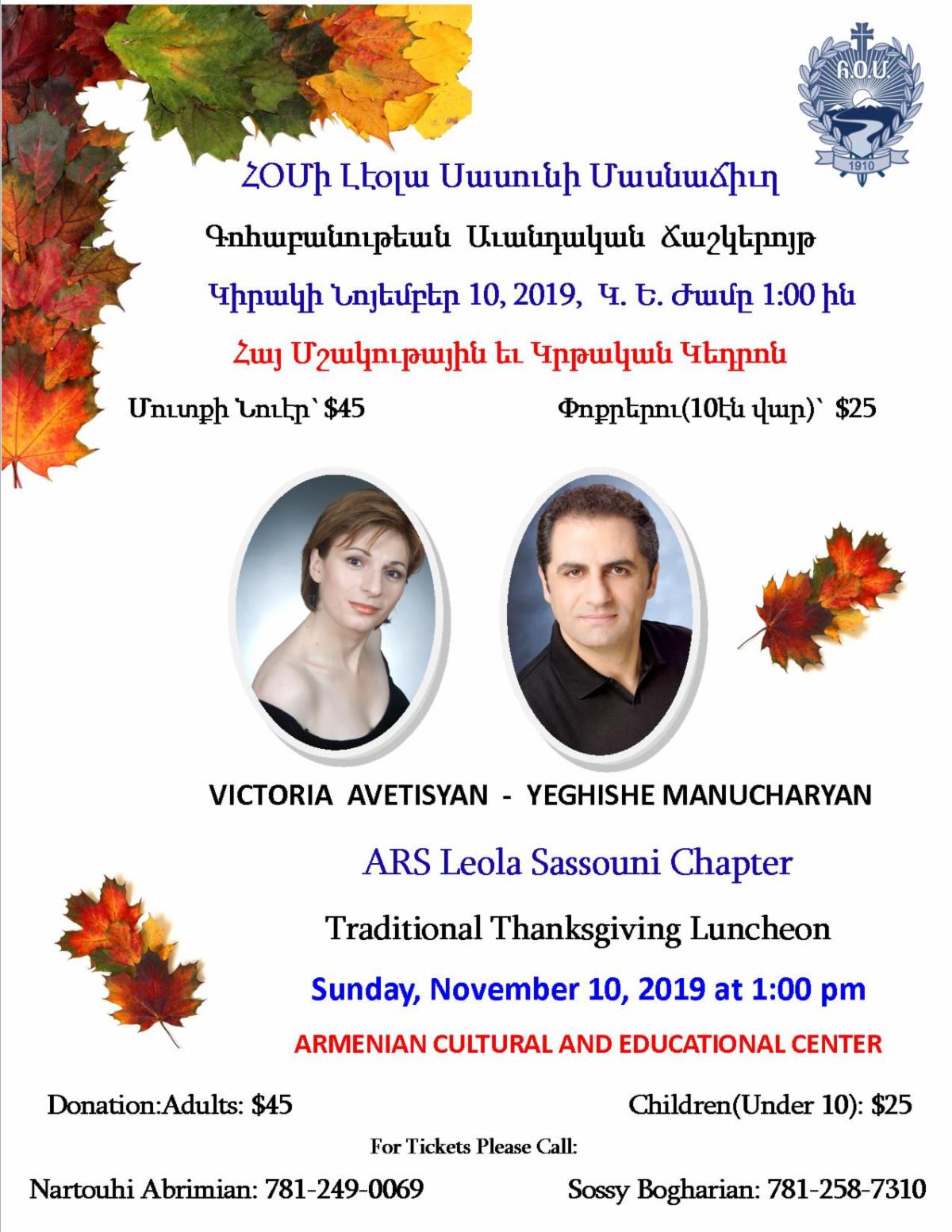 Traditional Thanksgiving Luncheon hosted by the ARS Watertown Leola Sassouni ARS Chapter. See flyer below for details.