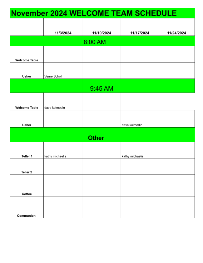 We always encourage and appreciate volunteers for the Welcome Team to help out with parts of the worship service, such as greeter, welcome table, usher, tellers, coffee server and Communion helpers.