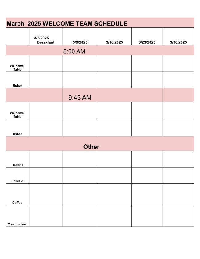 We always encourage and appreciate volunteers for the Welcome Team to help out with parts of the worship service, such as greeter, welcome table, usher, tellers, coffee server and Communion helpers.