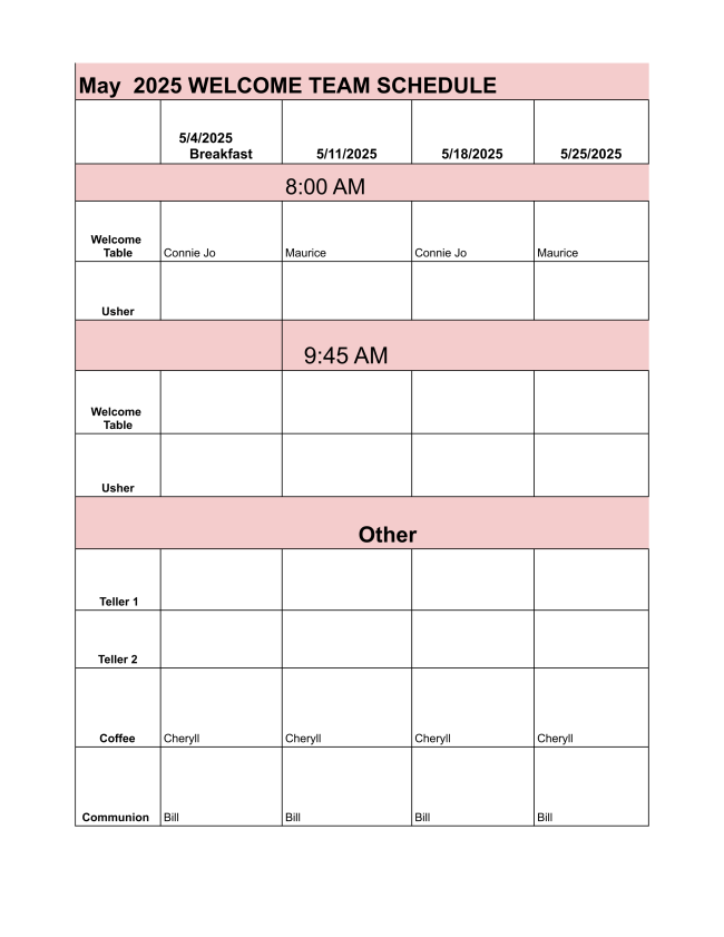 We always encourage and appreciate volunteers for the Welcome Team to help out parts of the worship service, such as greeter, welcome table, usher, tellers, coffee server and Communion helpers. If you would like to know more about these roles, please contact Pastor Heather as we need more hands here!