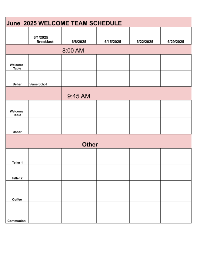 We always encourage and appreciate volunteers for the Welcome Team to help out parts of the worship service, such as greeter, welcome table, usher, tellers, coffee server and Communion helpers. If you would like to know more about these roles, please contact Pastor Heather as we need more hands here!