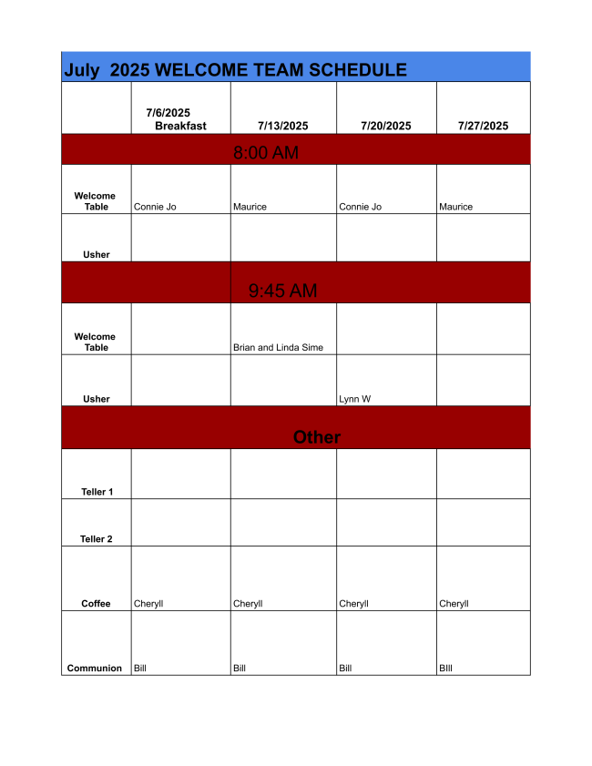 We always encourage and appreciate volunteers for the Welcome Team to help out parts of the worship service, such as greeter, welcome table, usher, tellers, coffee server and Communion helpers. If you would like to know more about these roles, please contact Pastor Heather as we need more hands here!
