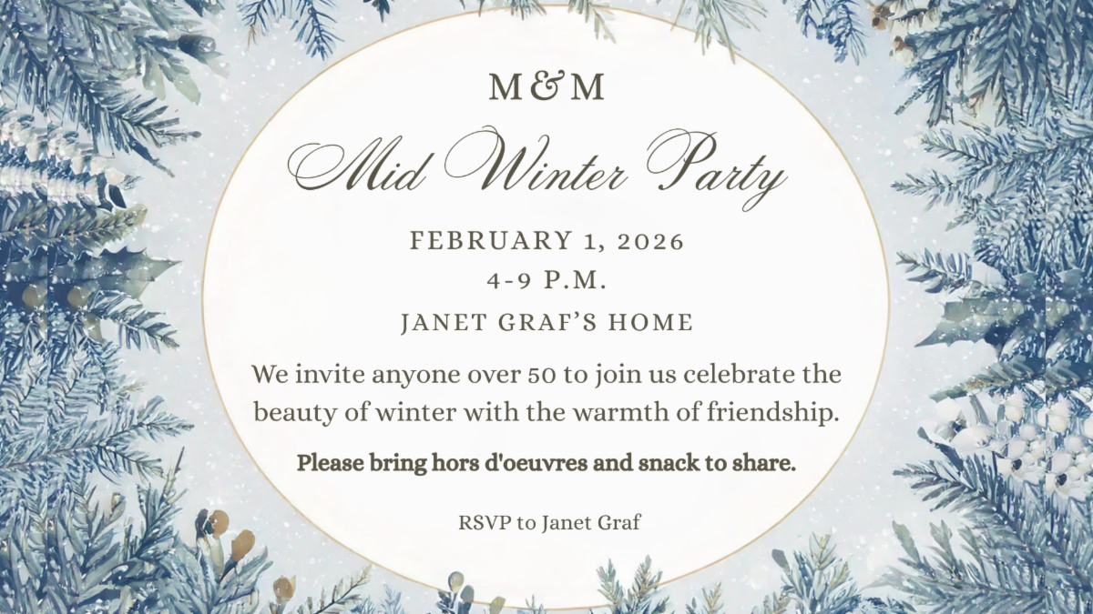 We invite anyone over 50 to attend the M&M Mid Winter Party at Janet Graf's house on Sunday, Feb 1, 4-9 p.m. Please bring hors d'oeuvres and snacks to share. RSVP with Janet Graf.