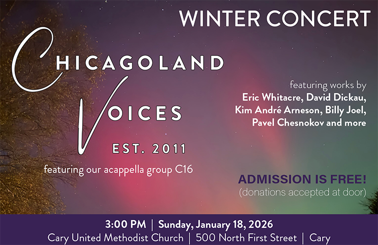 Chicagoland Voices will present a Winter Concert on Sunday, January 18, 2026 at 3:00 pm in Cary that will feature a wide variety of choral music including contemporary choral, spirituals, vocal jazz and many more styles. Some composers featured include Eric Whitacre, David Dickau, Kim Andre Arneson, Billy Joel, Pavel Chesnokov and many more. The concert is free to all and a free-will donation will be collected.
