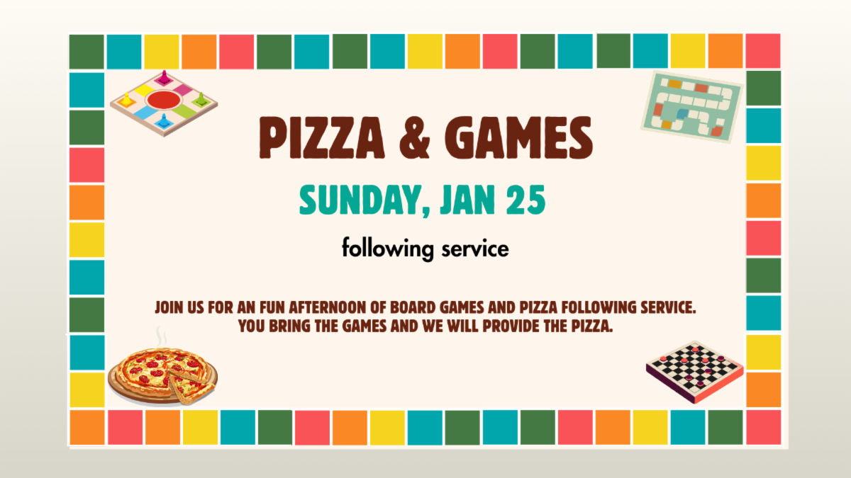 Join us for a Sunday afternoon of pizza and board games. You bring the games and we will supply the pizza.