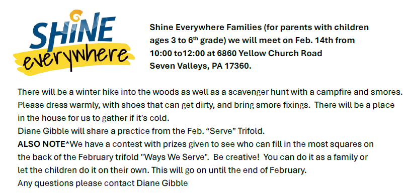 Additions and updates for prayer list or calendar of events are welcome by contacting the church office.