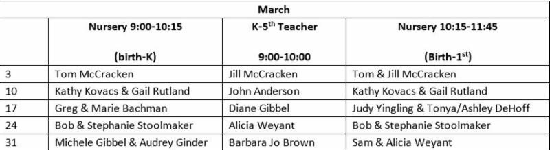 Thank you to all those who help with Children's Ministry. Your time, energy, and dedication are appreciated. If you need to make a schedule change or would like to serve as a teacher or in the nursery, please contact Michele Gibbel (717) 318-5442 or