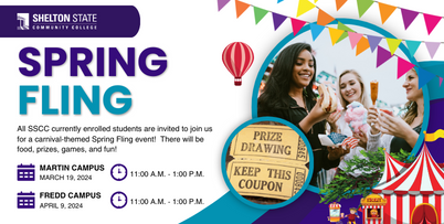 All currently enrolled SSCC students are invited to join in a day of fun, games, and prizes. Spring Fling 2024 will be held at the Martin Campus on March 19 and at the C.A. Fredd Campus on April 9. Both events will be held from 11:00 a.m. - 1:00 p.m.