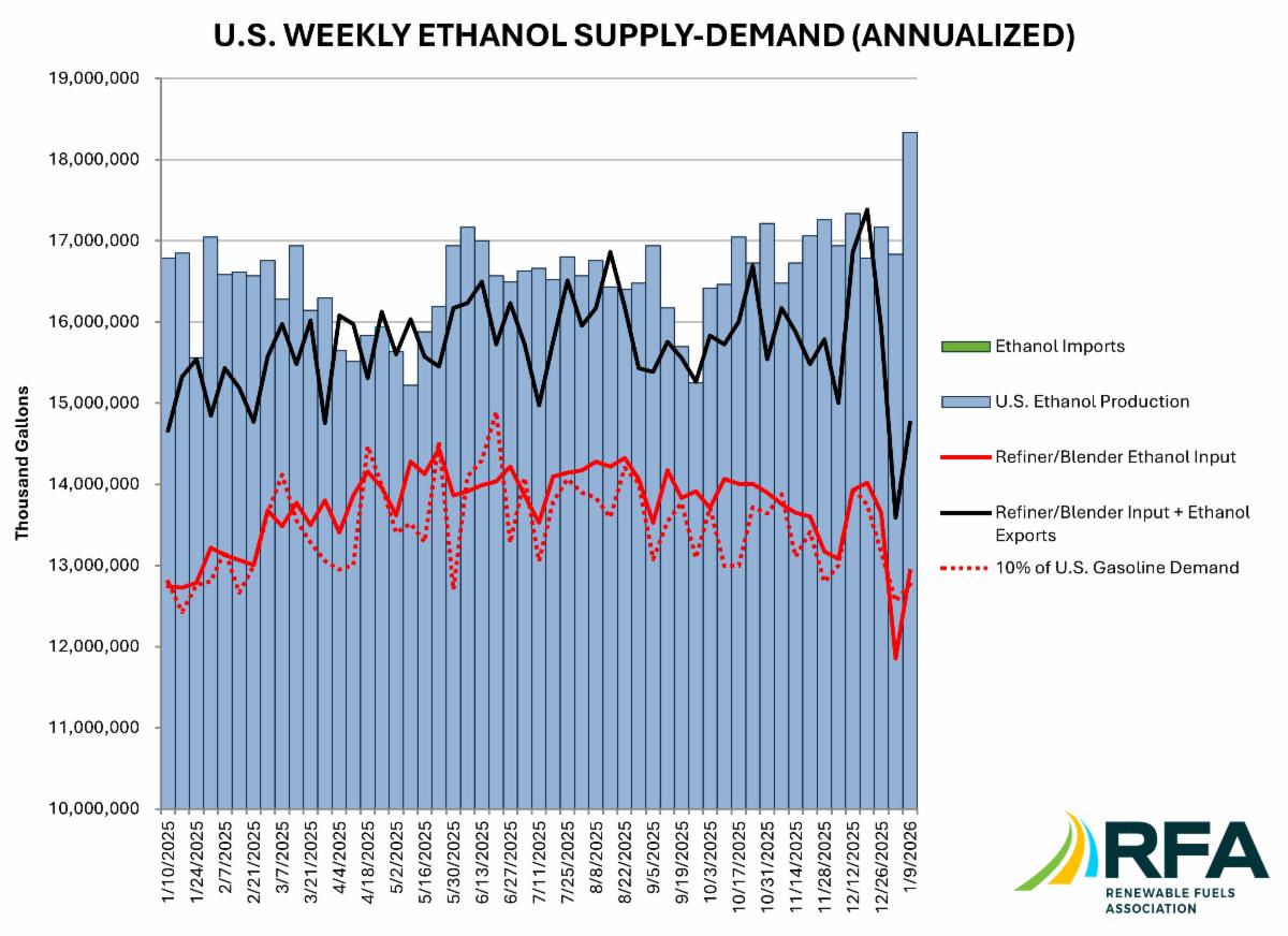 According to EIA data analyzed by the Renewable Fuels Association for the week ending January 9, ethanol production skyrocketed by 8.9% to a record high of 1.20 million b/d, equivalent to 50.23 million gallons daily. Output was 9.2% higher than the same week last year and 13.7% above the three-year average for the week. The four-week average ethanol production rate increased 1.4% to 1.13 million b/d, equivalent to an annualized rate of 17.32 billion gallons (bg).
