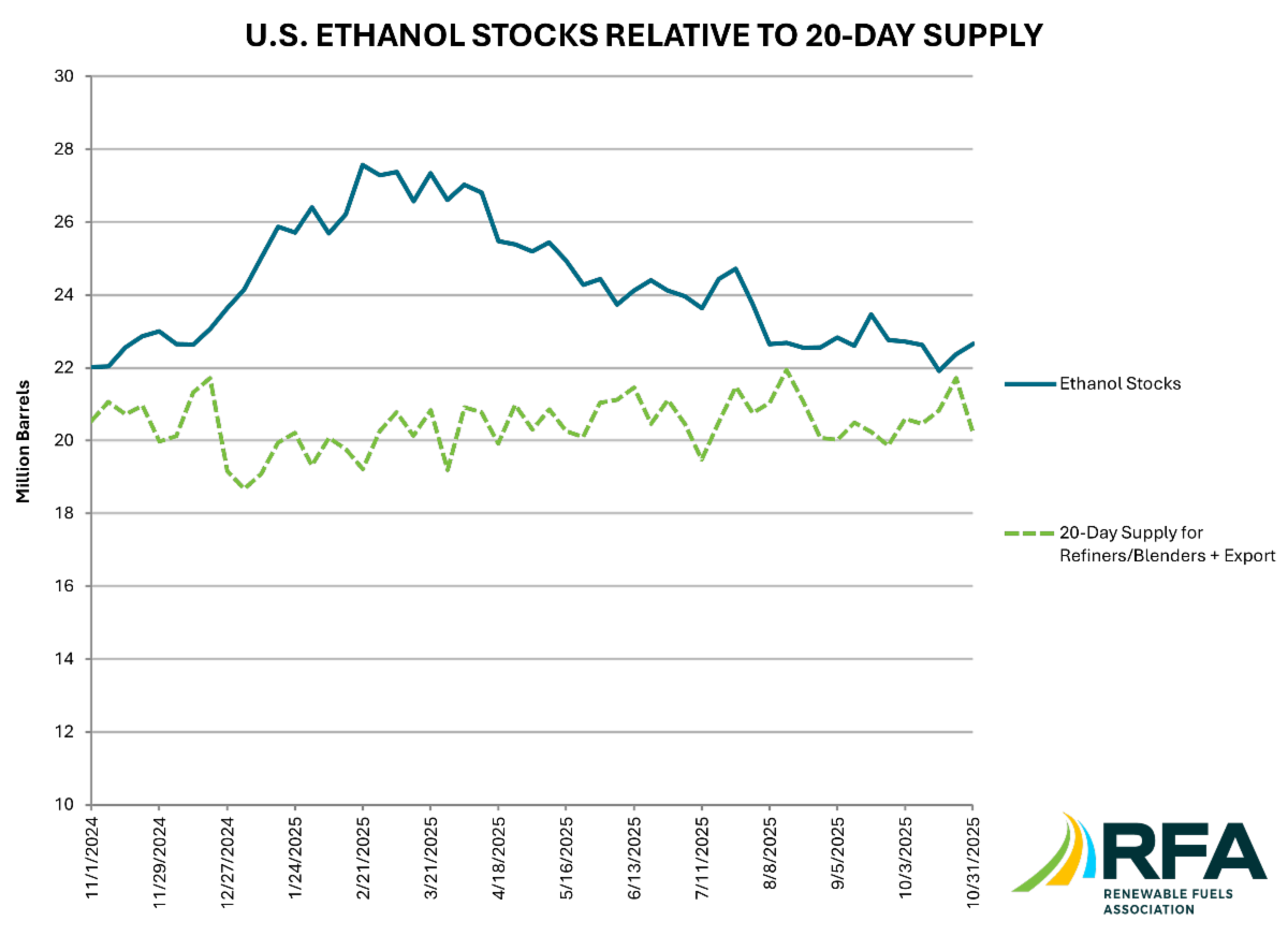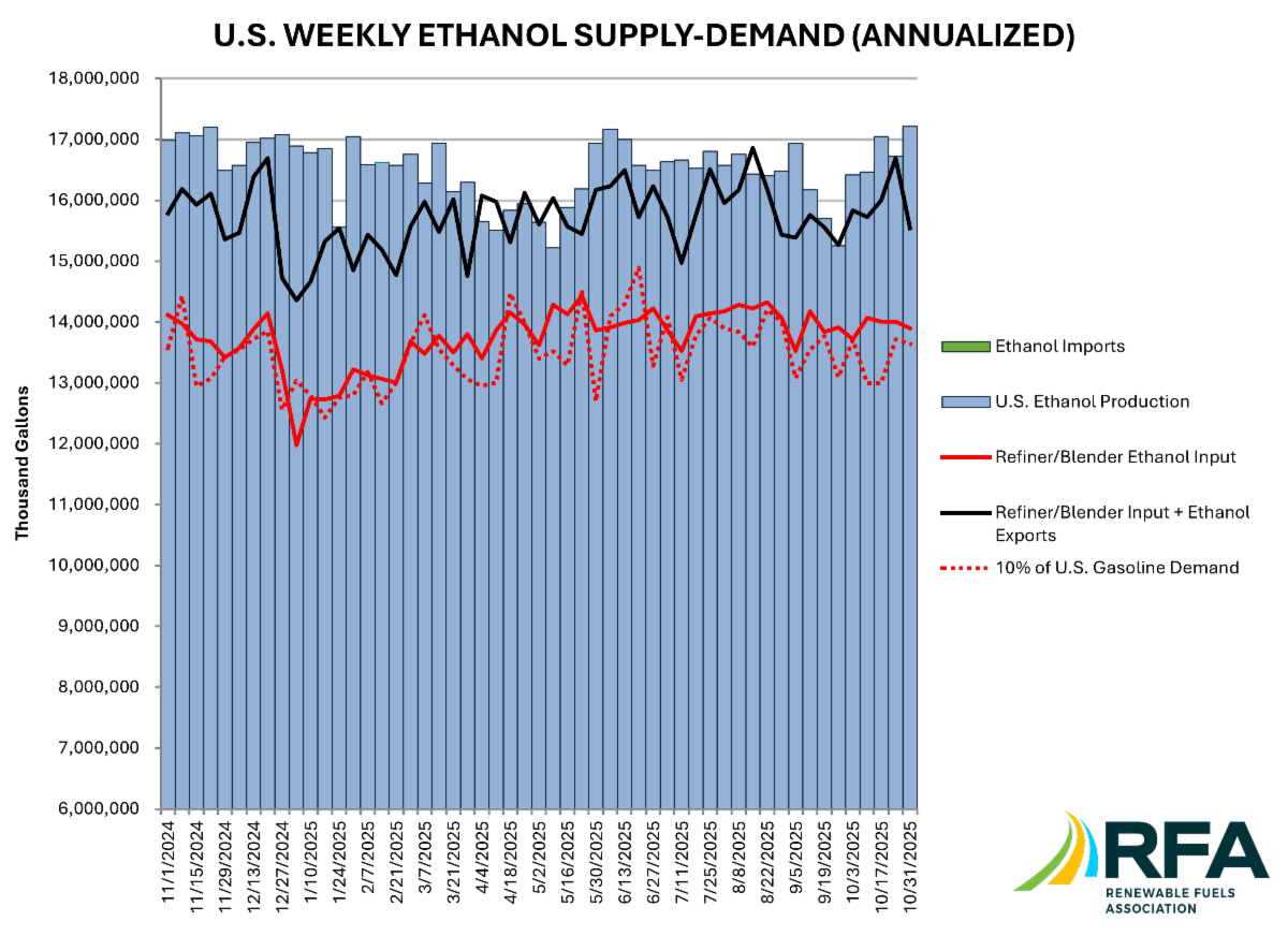According to EIA data analyzed by the Renewable Fuels Association for the week ending October 31, ethanol production ramped up 2.9% to a record high of 1.12 million b/d, equivalent to 47.17 million gallons daily. Output was 1.6% higher than the same week last year and 5.3% above the three-year average for the week. The four-week average ethanol production rate increased 1.2% to 1.10 million b/d, equivalent to an annualized rate of 16.91 billion gallons (bg).