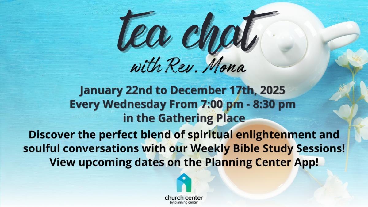"Discover the perfect blend of spiritual enlightenment and soulful conversations with weekly Tea Chat Bible Study Sessions! Together, we’ll explore God’s Word, reflect on its meaning, and embark on a journey of self-discovery and renewal. Join us as we infuse the essence of spirituality into every sip, guiding you on a journey of self-discovery and reflection. Let's put the 'tea' in spirituality together. Cheers to a harmonious mind, body, and spirit!"