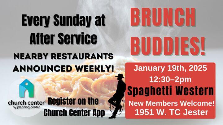 Join us after service for in-person Brunch Buddies, Sunday, January 19th, after service at Spaghetti Western, 1951 W. TC Jester. View MENU. | |