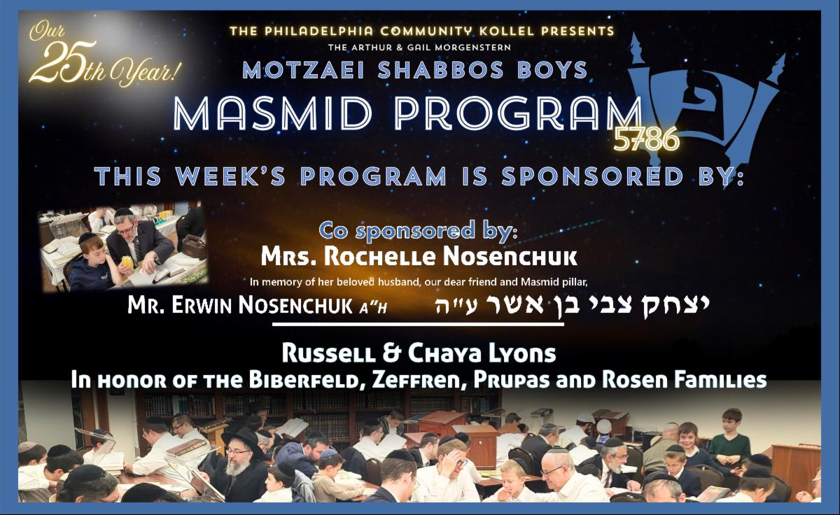 Join the crowd during long winter Motzaei Shabbosos at our ever-popular and exciting Masmid Program. Young boys come to learn with fathers, grandfathers, and mentors and enjoy great learning, stories, and raffle prizes! We welcome you to our 25th year.