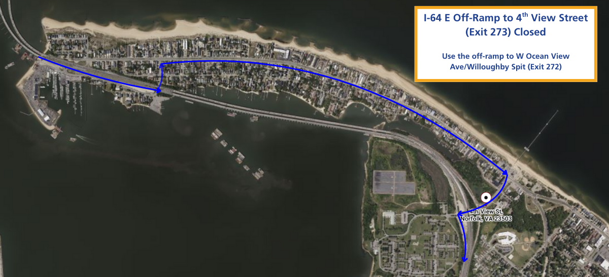 - Single lane closure on I-64 east from Willoughby Bay Bridge to 4th View St from 7 p.m. to 5 a.m.