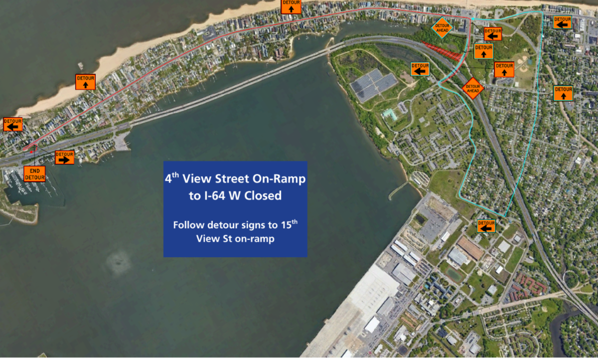 - Single lane closure on I-64 east from 1st View St to West Bay Ave from 7 p.m. to 5 a.m.