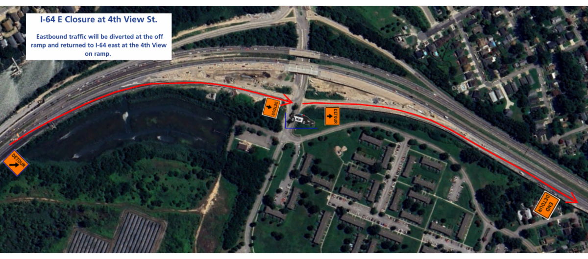 I-64 east interstate closure at 4th View St. Traffic diverted at off ramp and returns to I-64 east at 4th View on ramp. CLICK HERE for detour.