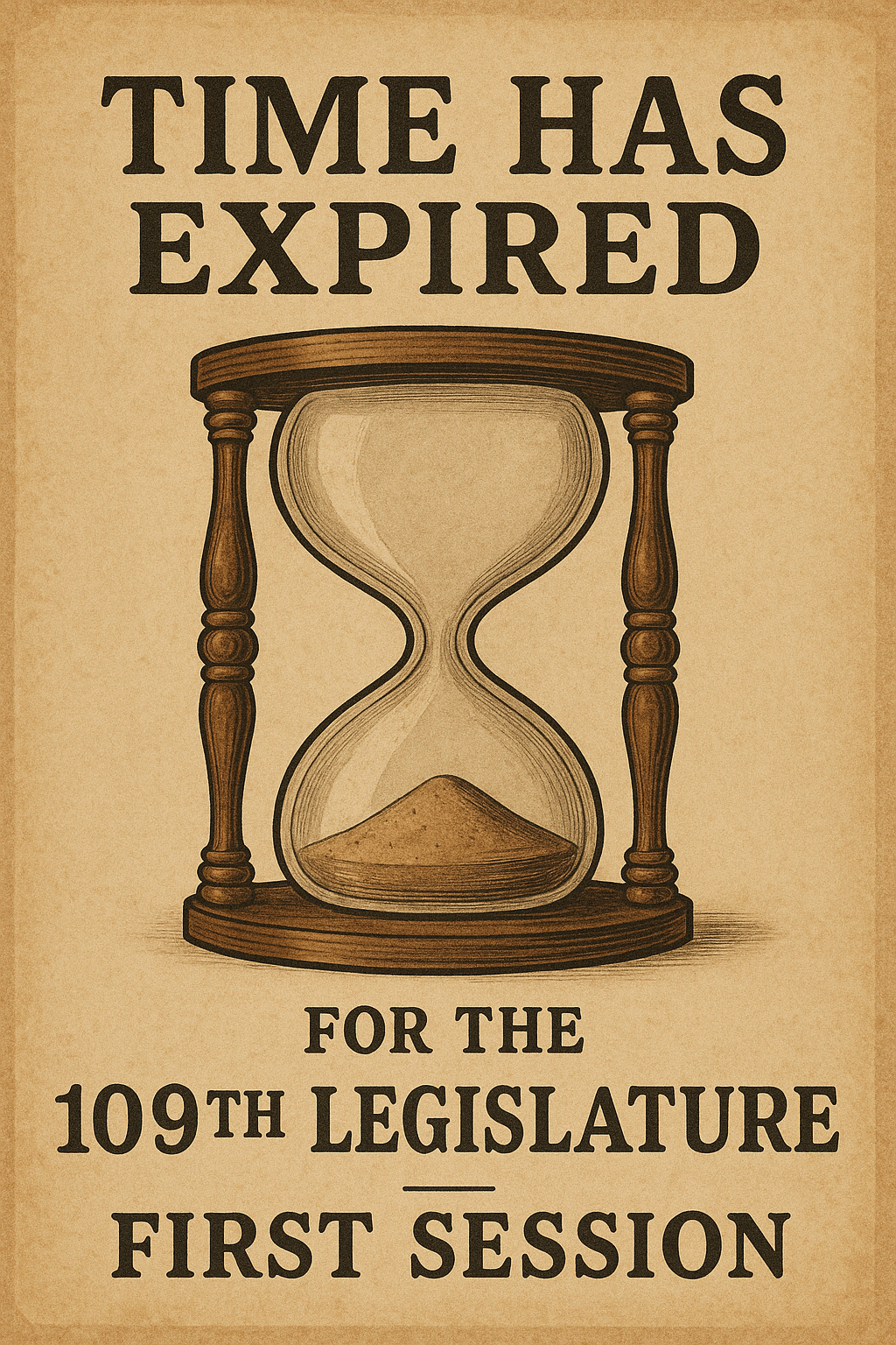 Being the first Session of the 109th Legislature, any bills that did not pass, or were not amended into other bills, or killed by their committee of jurisdiction, will remain in play for the 2nd Session of the 109th Legislature, which is scheduled to commence on Wednesday, January 7, 2026.