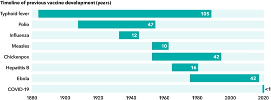As you can see from the chart above, it took nearly 50 years for the polio vaccine to be introduced, and it took more than 40 years for the chickenpox and Ebola vaccines to be approved for everyday human use.