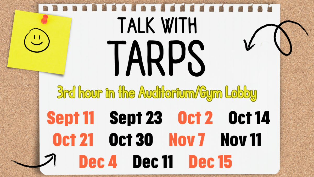 Talk with Tarps is open to all students and staff members. Come chat with Dean of Student Affairs Mrs. Tarplin during 2nd hour in the Lobby on the following days and ask questions, express concerns, complaints, compliments, or just have a casual conversation. Snacks will be provided!