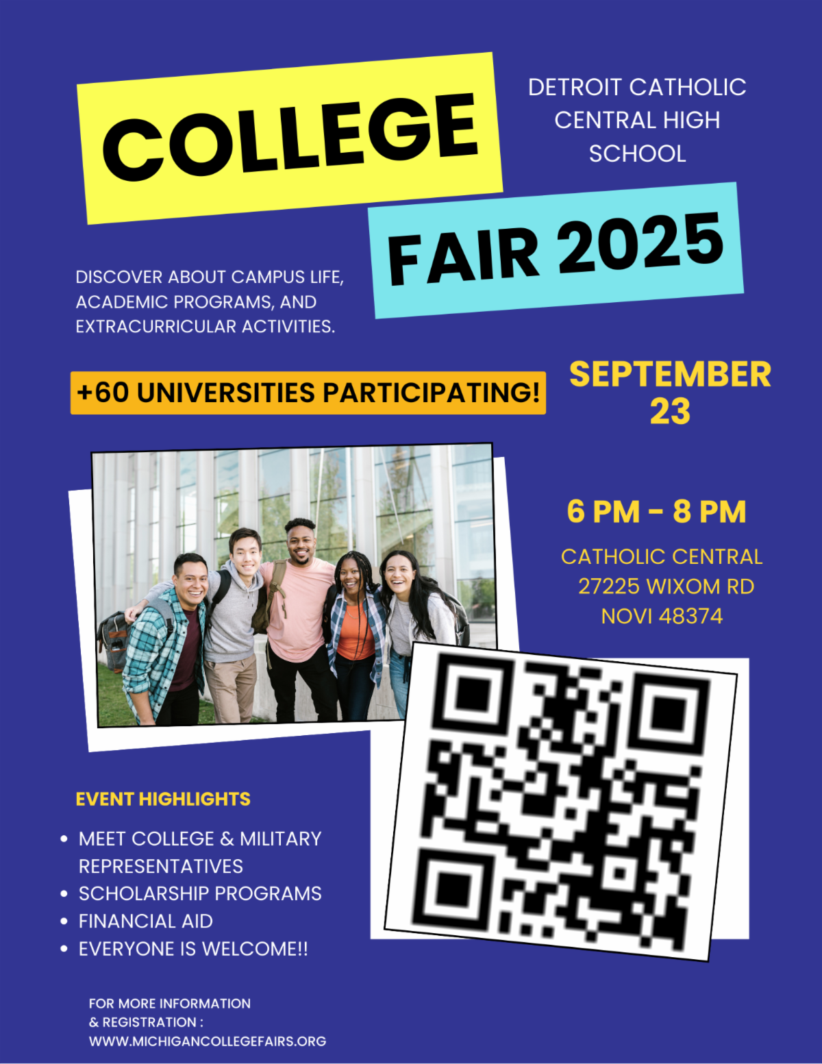All students and families are welcome to attend. To make the most of the evening, interested students should register in advance at michigancollegefairs.org or app.strivescan.com/registration. Registrants will receive a personalized barcode that college representatives can scan to gather your information quickly and easily. Students may also register using the QR code on the flyer here.