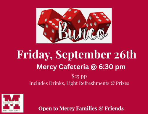 Mercy parents/guardians, staff, alumnae and friends of Mercy are invited for a fun-filled night of Bunco. Includes games, drinks, light refreshments and prizes.