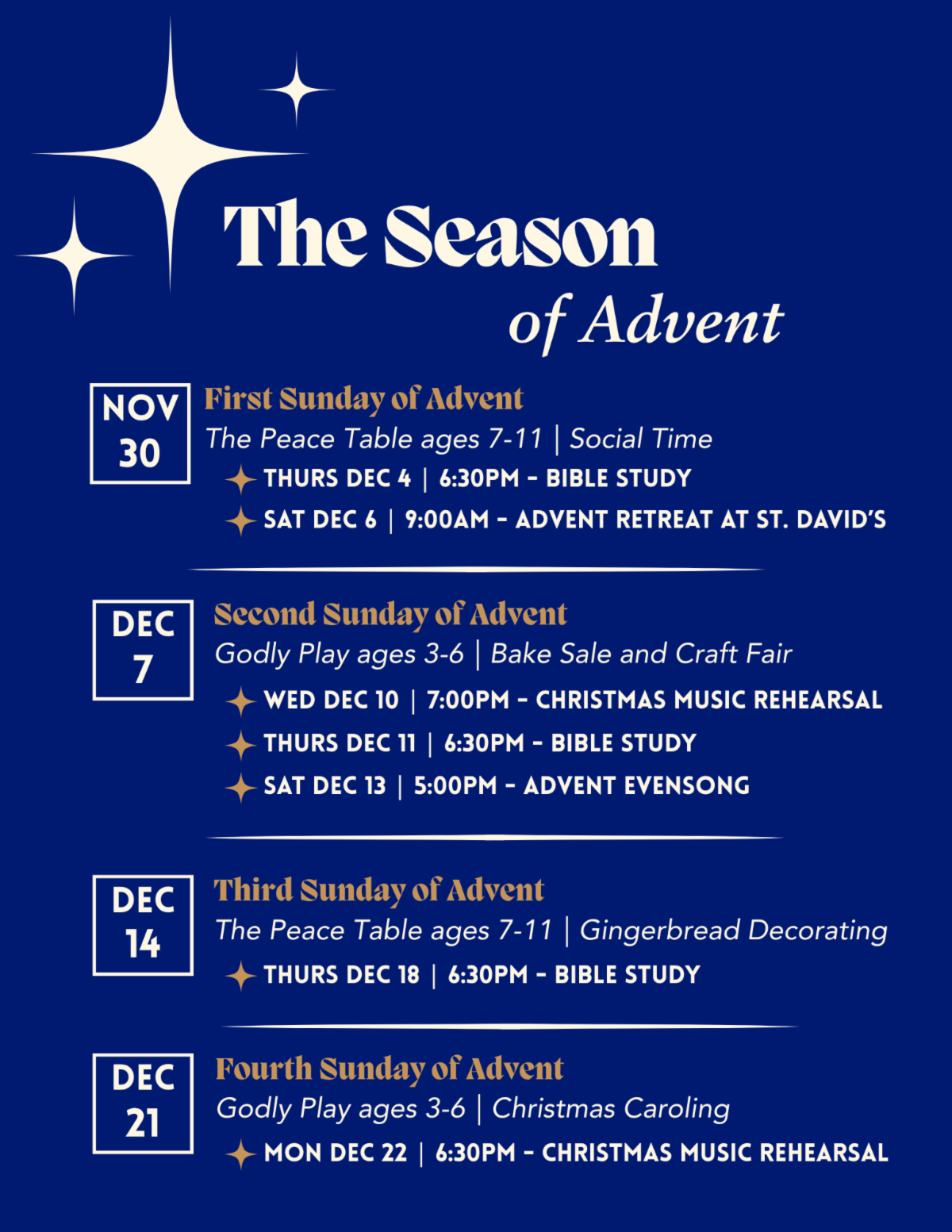 Save the date on your busy holiday calendars for one of St David’s favorite forums “Coffee and Carols”, followed by one of our favorite outings of the year, “Christmas Caroling” for our homebound friends. After the 9:30 service, on December 21st, all parishioners can head downstairs to the undercroft where the coffee hour for the day will be enjoying delicious treats along with some old-fashioned Christmas Caroling. Roger will be at the piano and lead us all in holiday song. We will even face time those parishioners we cannot visit in person with a carol from the undercroft.