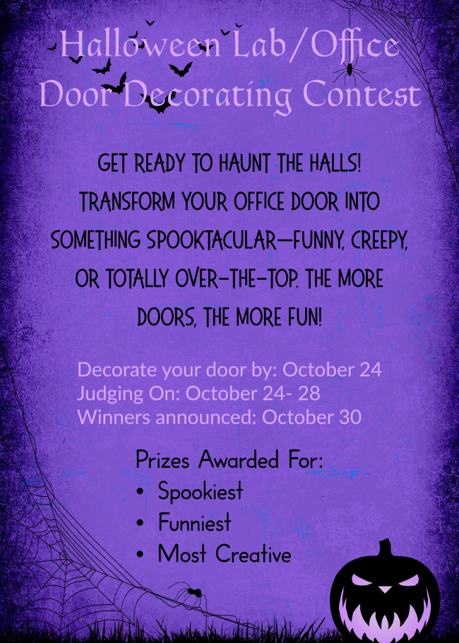 It’s that spooky time of year...time to bust out the cobwebs, skeletons, and googly eyes for our Halloween Office/Lab Door Decorating Contest! 🕷️