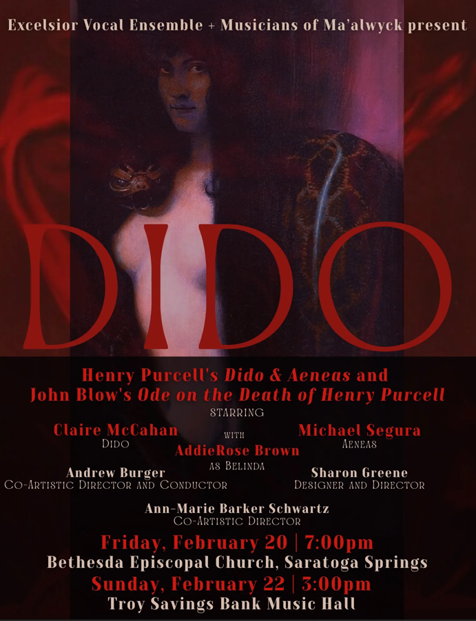 Excelsior Vocal Ensemble in collaboration with Musicians of Ma’alwyck, present Dido & Aeneas, directed and costumed by Sharon Greene '15, with musical direction by AHN's Music & Chorus Teacher Andrew Burger.