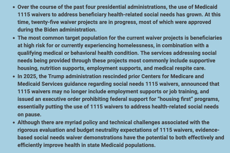 Furthermore, CMS recently announced other shifts in 1115 waiver priorities, warning that waivers focusing on continuous eligibility, job training, or employment-related services will no longer be approved or extended. In addition, a July 2025 executive order states that the federal government will take actions “ending support for ‘housing first’ policies that deprioritize accountability and fail to promote treatment, recovery, and self-sufficiency.”