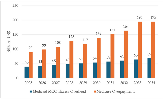 Exhibit 1: Projected savings from eliminating Medicare Advantage overpayments and Medicaid managed care organization excess overhead, 2025–34