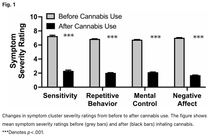As further depicted in Fig. 1, mean Sensitivity severity ratings were significantly reduced from 7.27 (SE = 0.12) to 2.32 (SE = 0.11) (p < .001) which represents a decrease of 68.09% from before to after cannabis use. Similarly, ratings of Repetitive Behavior severity were significantly reduced from 6.86 (SE = 0.03) to 2.03 (SE = 0.04) from before to after use (p < .001) (representing a 70.41% reduction). Ratings of the severity of problems with Mental Control were significantly reduced from 6.75 (SE = 0.03) to 2.12 (SE = 0.04) (p < .001) which indicates a 68.59% reduction, and ratings of the severity of symptoms of Negative Affect were significantly reduced from 7.02 (SE = 0.03) before cannabis use to 1.70 (SE = 0.03) after cannabis use (p < .001) representing a 75.78% reduction in severity of this symptom cluster. Collapsed across all three symptom domains, symptom severity ratings were reduced from a mean of 6.95 (SE = 0.02) before cannabis use to 1.87 (SE = 0.02) after cannabis use which represents an overall reduction in all symptom ratings combined of 73.09%.