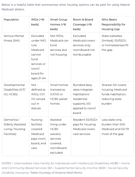 The IMD exclusion, meant to prevent warehousing in large, locked hospitals, evolved into a blanket ban on Medicaid’s participation in almost ALL housing for adults with SMI—even small, unlocked, community-based group homes with fewer than 16 beds.
