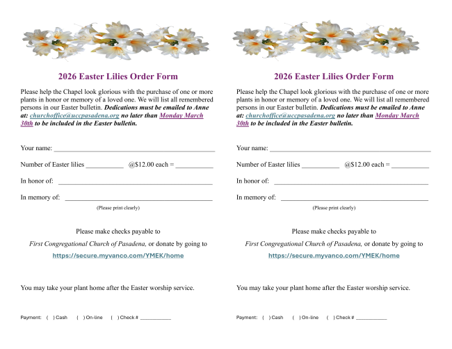 Dedications must be emailed to Anne at: churchoffice@uccpasadena.org no later than Monday March 30th to be included in the Easter bulletin.
