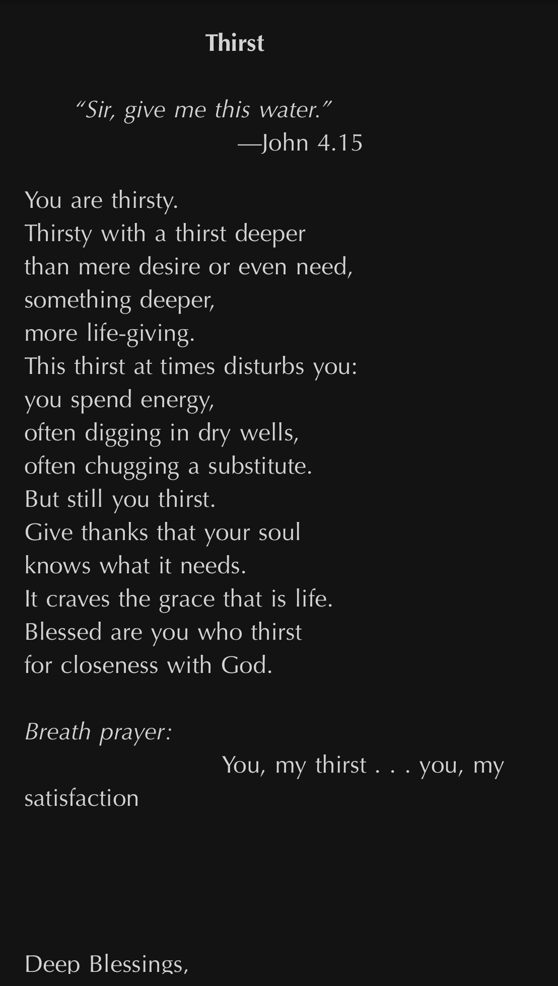 7 A Samaritan woman came to draw water, and Jesus said to her, “Give me a drink.” 8 (His disciples had gone to the city to buy food.) 9 The Samaritan woman said to him, “How is it that you, a Jew, ask a drink of me, a woman of Samaria?” (Jews do not share things in common with Samaritans.)[a 10 Jesus answered her, “If you knew the gift of God and who it is that is saying to you, ‘Give me a drink,’ you would have asked him, and he would have given you living water.” 11 The woman said to him, “Sir, you have no bucket, and the well is deep. Where do you get that living water? 12 Are you greater than our ancestor Jacob, who gave us the well and with his sons and his flocks drank from it?” 13 Jesus said to her, “Everyone who drinks of this water will be thirsty again, 14 but those who drink of the water that I will give them will never be thirsty. The water that I will give will become in them a spring of water gushing up to eternal life.” 15 The woman said to him, “Sir, give me this water, so that I may never be thirsty or have to keep coming here to draw water.”