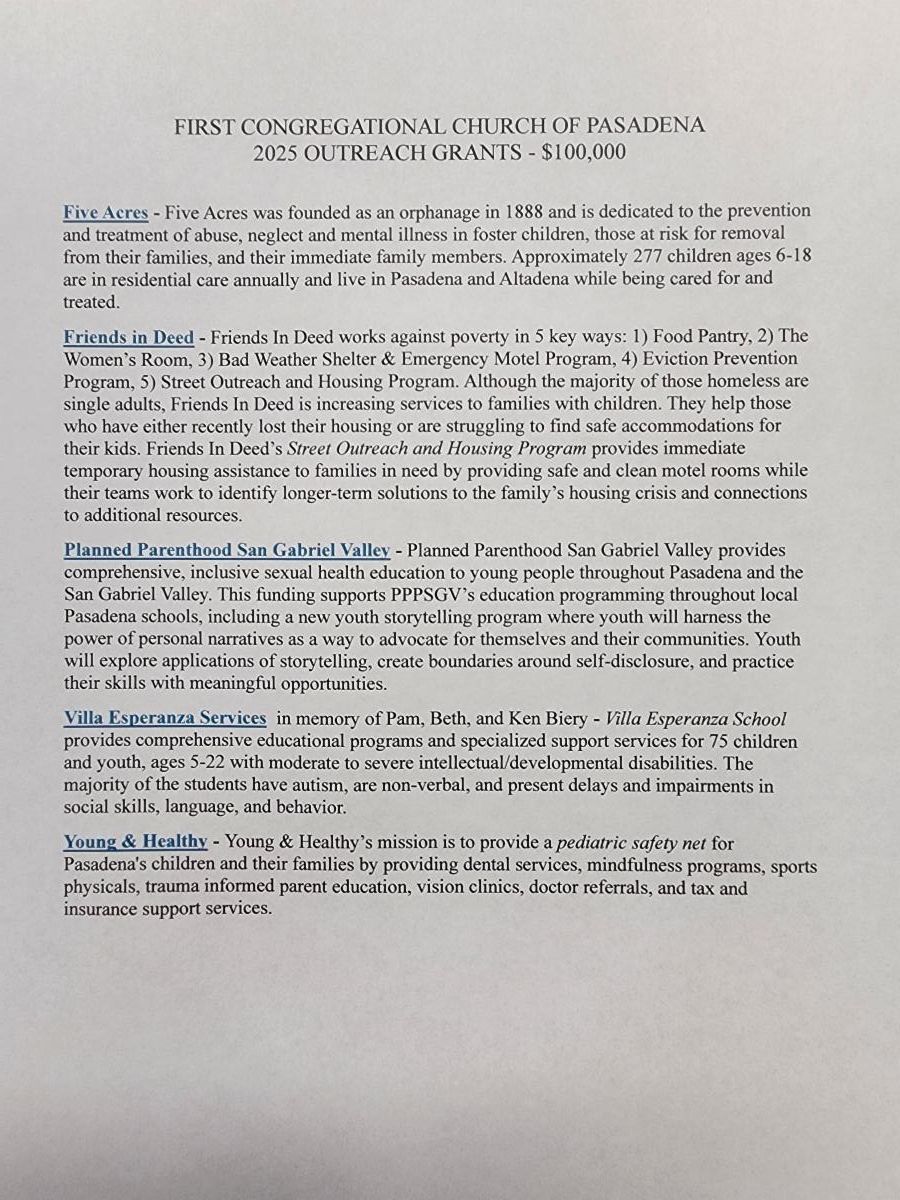 This year the Outreach Grants Committee decided to forego our customary grant application process and to award grants to a few long-term partners who we believe were greatly impacted by the Eaton Canyon Fire either directly or indirectly through the impact on the communities that they serve. We reviewed the list of organizations funded going back to the beginning of our grants in 2019 and picked five recipients for this year’s grants totaling $100,000. (Click on each to see their website.)
