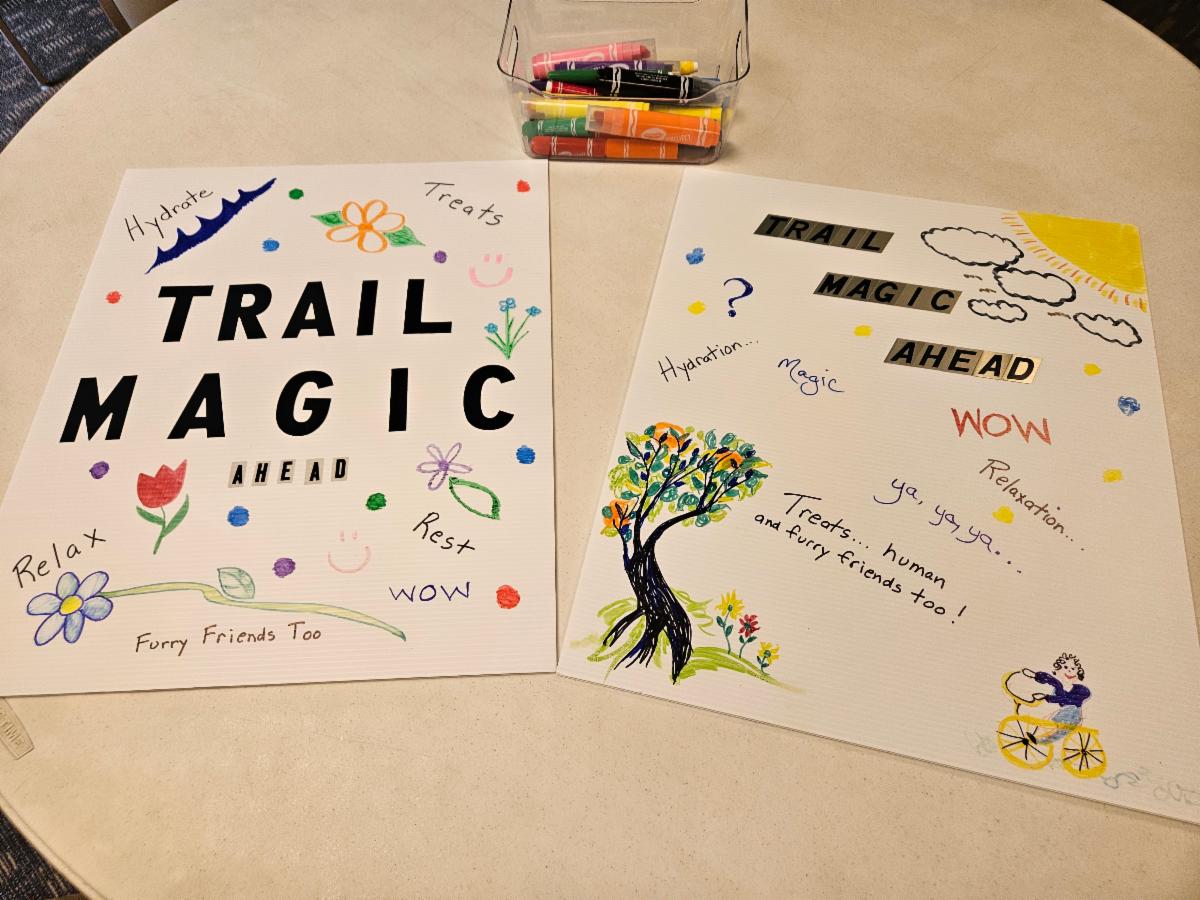 The TRAIL MAGIC signs are now beautifully decorated (THANKS ALL) , so we are ready to partake in our Faithful Innovation Experiment #2. Join us this coming Sunday around 11ish after church, as we meet our neighbors down by the trail.